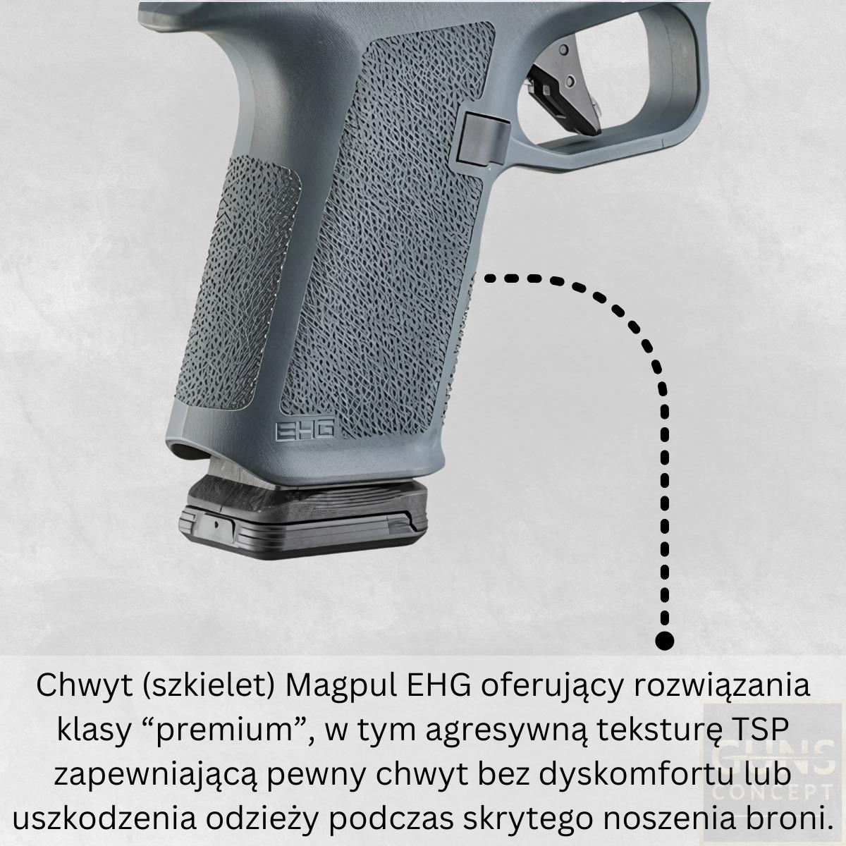 • Chwyt (szkielet) Magpul EHG oferuje rozwiązania klasy premium, w tym agresywną teksturę TSP zapewniającą pewny chwyt bez dyskomfortu lub uszkodzenia odzieży podczas skrytego noszenia broni.