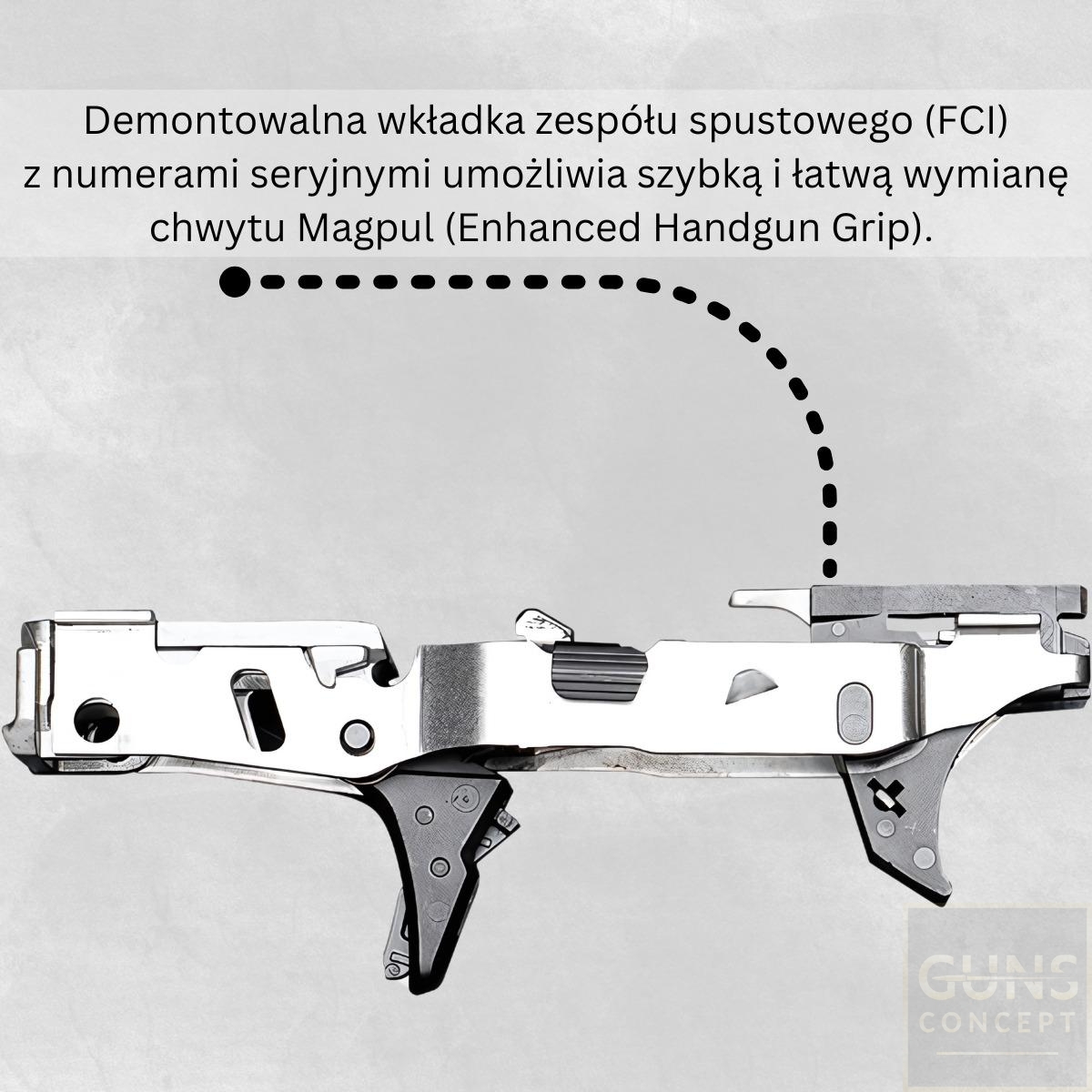 • Wyjmowana wkładka zespółu spustowego (FCI) z numerami seryjnymi umożliwia szybką i łatwą wymianę chwytu dostępnego z szerokiej palety Magpul (Enhanced Handgun Grip). Wykonana została ze stali nierdzewnej i zapewnia indywidualne dopasowanie do dłoni strzelca.