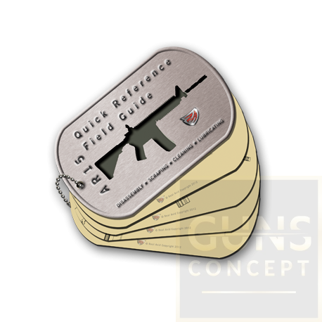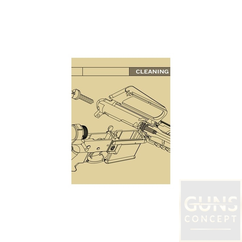 Instrukcja AR15 zawita najważniejsze informacje dotyczące konserwacji w zwartej, odpornej na chemikalia formie. Zawiera łatwe do zrozumienia ilustracje, pokazujące jak rozebrać karabin w celu dokładnego zeskrobania i oczyszczenia z węgla.