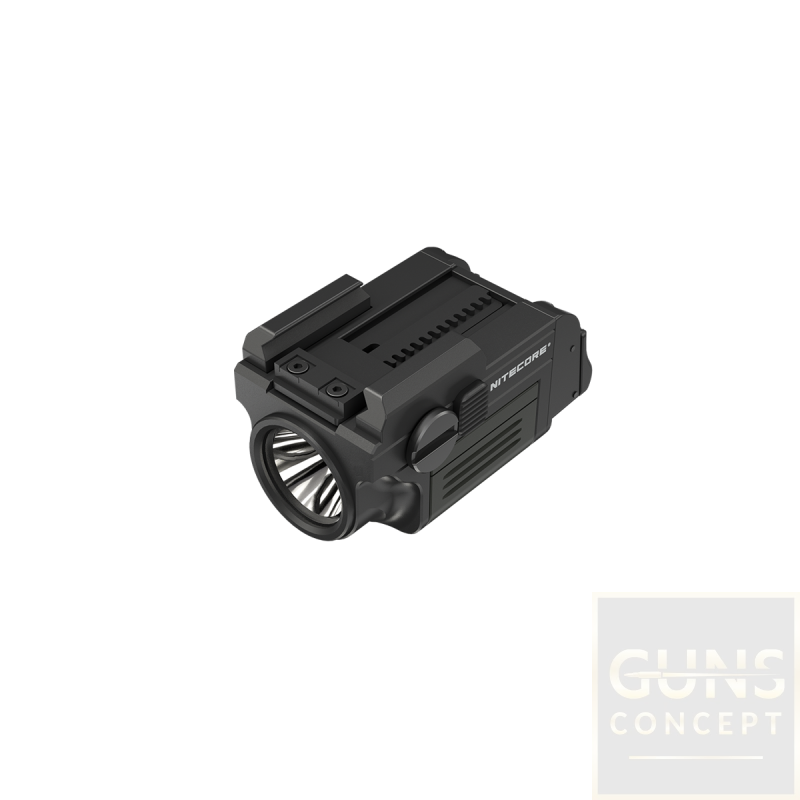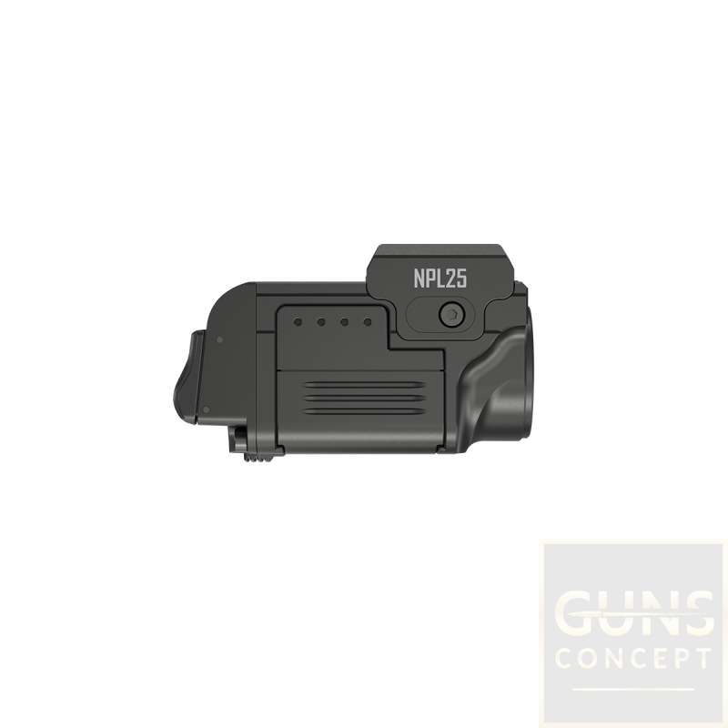 Kompaktowa latarka taktyczna do broni Nitecore NPL25 z diodą UHi 20 o maksymalnym strumieniu świetlnym do 900 lumenów, kompatybilna z szyną Glock oraz Picatinny.