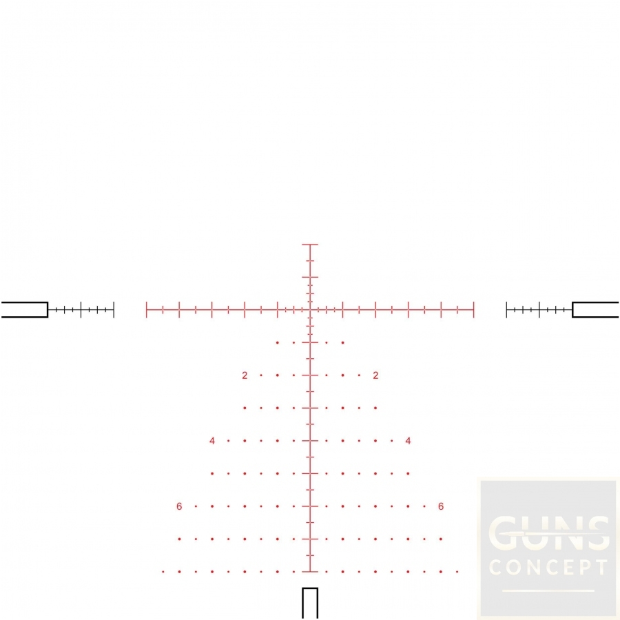 - Osadzony w drugim planie krzyż (SFP) z podświetleniem o rozbudowanej siatce Mil Pro