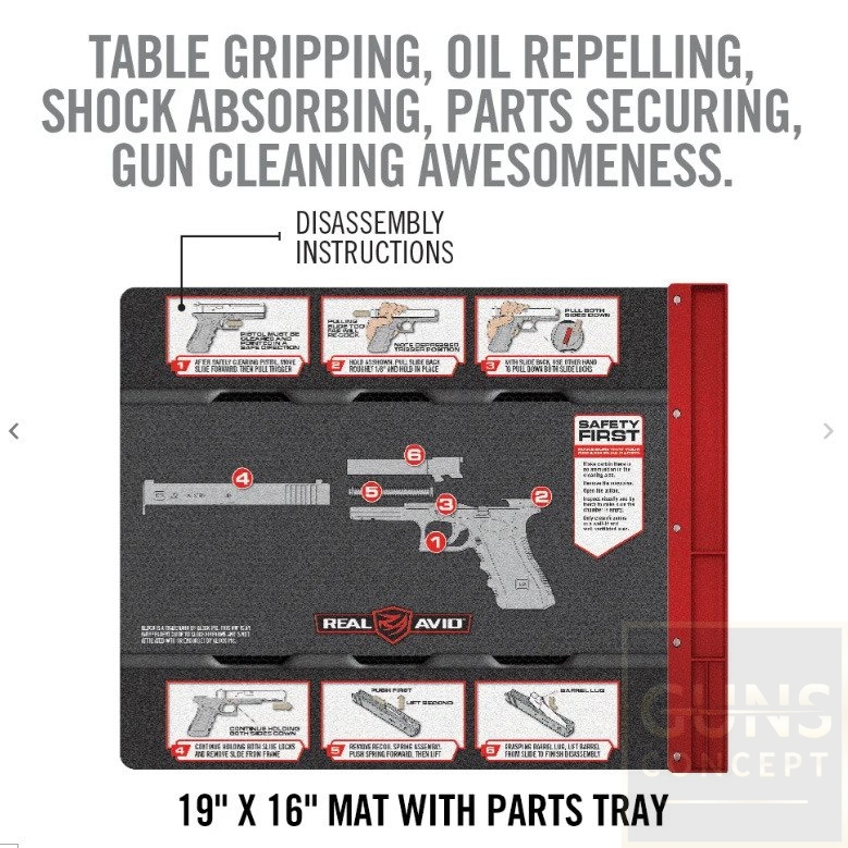 Mata antypoślizgowa z odporną na działanie oleju powierzchnią chroni przed uszkodzeniem zarówno elementy broni, jak i powierzchnię blatu. Zamocowany na jej prawej krawędzi organizer na części z tacką magnetyczną zapobiega zgubieniu zdemontowanych elementów.