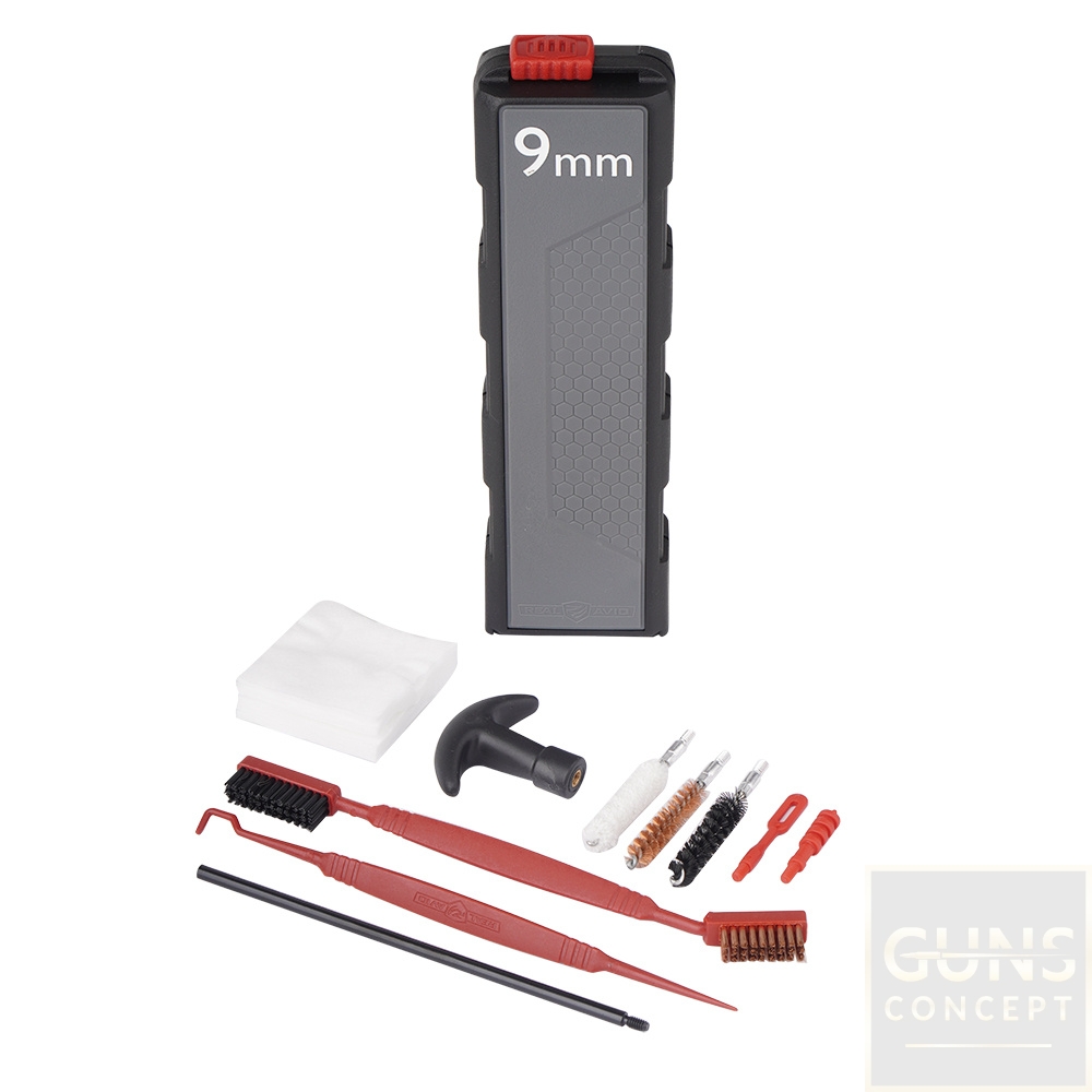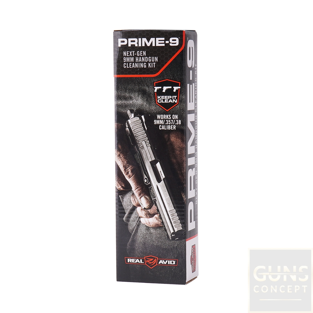 Zestaw do czyszczenia broni Prime-9 od firmy Real Avid zapakowany w pudełko z trwałego tworzywa, w którym wszystkie elementy zestawu posiadają dedykowane miejsce z uchwytem, co unieruchamia je i zabezpiecza na czas transportu. Zawiera wszystkie niezbędne narzędzia do przeprowadzenia czyszczenia i konserwacji pistoletów oraz rewolwerów kalibru 9 mm / .357 / .38. Kompaktowy rozmiar zestawu zajmie niewiele miejsca w plecaku wojskowym czy torbie, którą zabieramy na strzelnicę.