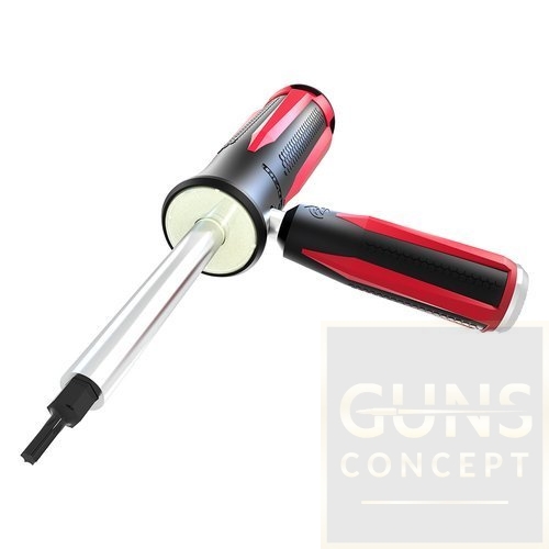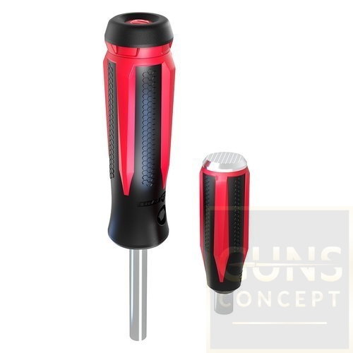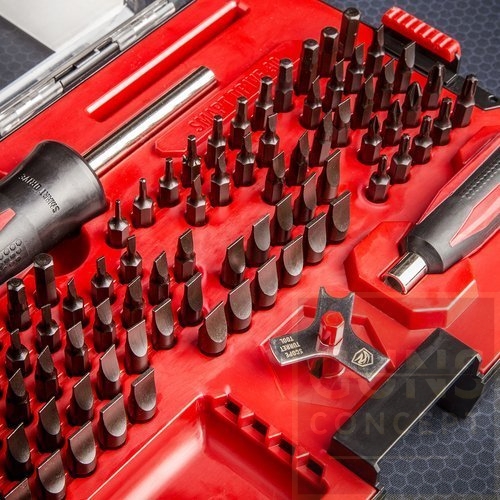 Zestaw dwóch śrubokrętów rusznikarskich z zestawem 87 pasujących do nich bitów, przenoszony w zamykanej skrzynce z tworzywa.