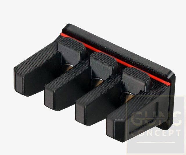 Uchwyty do magazynków Holdmymag charakteryzują się modułową konstrukcją. Składa się z listwy montażowej oraz mocowań dedykowanych do konkretnych typów magazynków. Każde mocowanie ma indywidualny magnes nośny (neodymowy), co za tym idzie siła docisku do ściany szafy jest zawsze optymalna do ilości powieszonych magazynków.