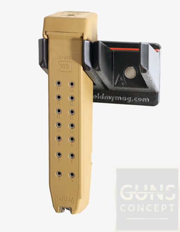 Uchwyty do magazynków Holdmymag charakteryzują się modułową konstrukcją. Składa się z listwy montażowej oraz mocowań dedykowanych do konkretnych typów magazynków. Każde mocowanie ma indywidualny magnes nośny (neodymowy), co za tym idzie siła docisku do ściany szafy jest zawsze optymalna do ilości powieszonych magazynków.