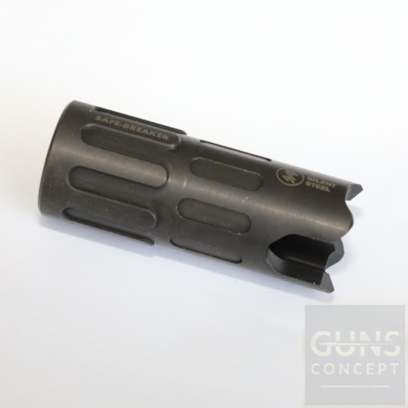 Safe-Breaker można zainstalować na wszystkich urządzeniach wylotowych Silent Steel. O-ring urządzenia wylotowego utrzymuje Safe-Breaker bezpiecznie na swoim miejscu i pozwala Safe-Breakerowi obracać się i indeksować do preferowanej pozycji. Po umieszczeniu pręta wzmacniającego w gnieździe Safe-Breaker, blokada typu o-ring umożliwia obrócenie karabinu do preferowanej i bezpiecznej pozycji przed oddaniem strzału.